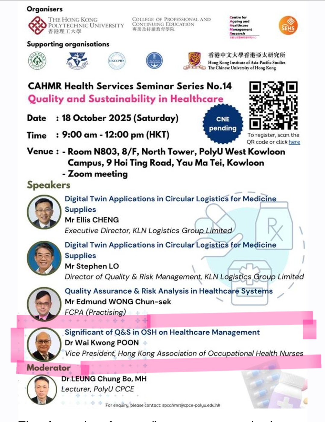 Topic : Significant of Q&S in OSH on Healthcare Management (Speaker: Dr. POON Wai Kwong, Vice President, HKAOHN)